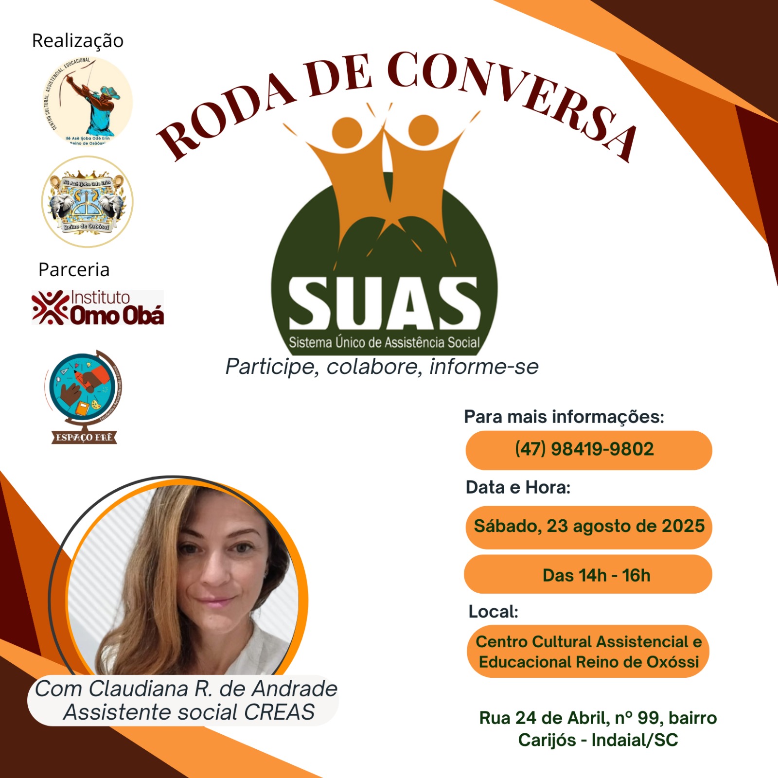 Sejam todos muito bem-vindos e bem-vindas à nossa Roda de Conversa do Sistema Único de Assistência Social – SUAS. Este é um espaço de partilha, diálogo e acolhimento, onde buscamos fortalecer nossa comunidade por meio da informação, do apoio social e da construção coletiva. Conduziremos uma conversa aberta com a assistente social Claudiana R. de Andrade, do CREAS, que irá trazer reflexões importantes sobre os desafios e as possibilidades de atuação no âmbito da assistência social. Será um momento de escuta, aprendizado e troca de experiências, onde cada voz presente aqui tem valor. A roda de conversa é grauita e possui entrada livre.